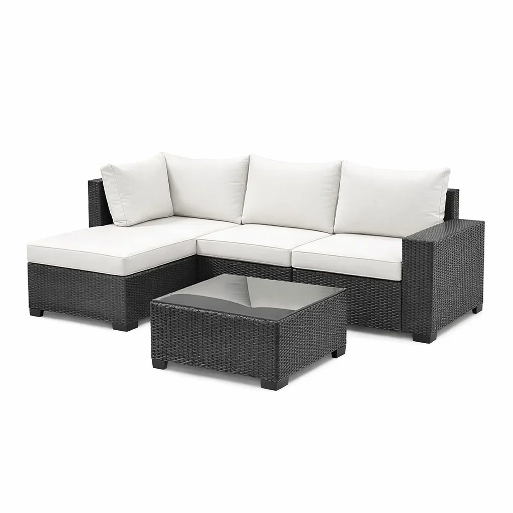 Ensemble de canapés en résine tressée beige avec table basse en verre